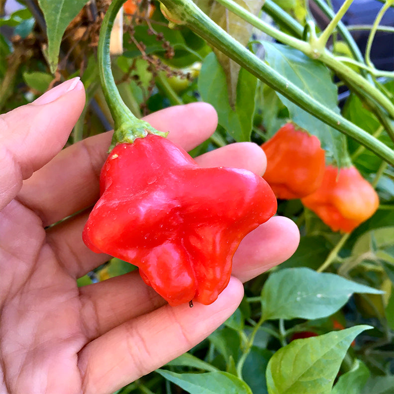 Based on my research, it seems that this variety also may go by the name Nepalese Bell, which is rare variety in North America. These peppers thrive best in 90+F bringing a plant full of fruits. By late fall another set of fruits emerge. In zone 9 and 10, these peppers are continuing to thrive in a full sun location with days ranging in 55F-38F, with couple of 32F nights in winter. It’s surprising how they tolerate the cold much better than other pepper plants.