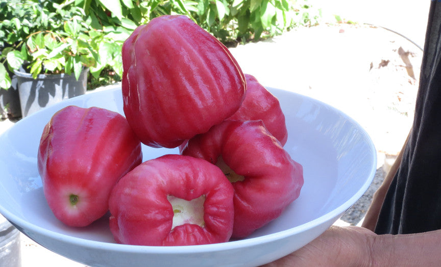 Jambu is a tropical fruit native to South East Asia. It likes full sun, heat and humidity, but can be cold hardy up to about 35F+ for short periods. It is semi deciduous. Regular watering, or rainfall is enough to sustain the tree.