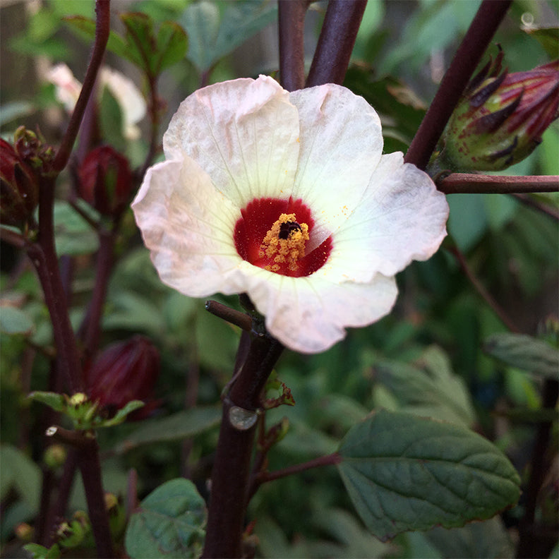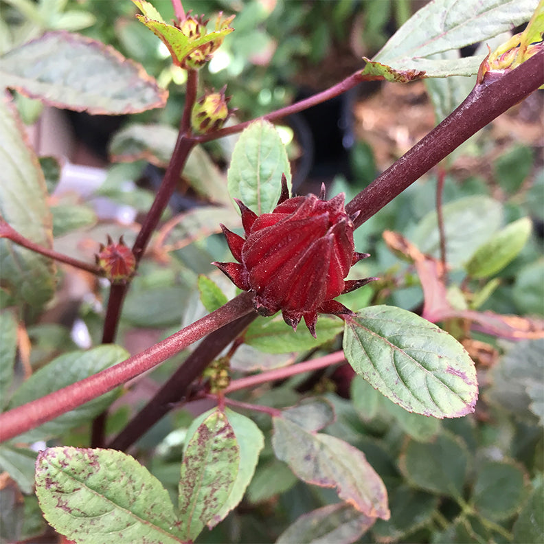 Roselle (Hibiscus sabdariffa) is a tropical shrub with edible leaves and calyces contains vitamin C, B2, A, Magnesium, Phosphorus, carotene, anthocyanin, iron and more. Roselle is also known Hibiscus, Florida Cranberry, Jamaican Sorrel. It is a fast growing shrub that is heat loving, and sensitive to the cold. It grows 5-7 FT tall and wide if given the space so be sure to provide at least 10-15 gallon soil. In colder regions the Roselle is grown as an annual plant. It thrives well in full sun, even in areas with 100F+ summers. As long as the Roselle is provided with well drained soil, regular watering to maintain soil moist, and lots of sunshine — this plant will thrive beautifully. Once the day starts to get shorter, buds will begin to develop.